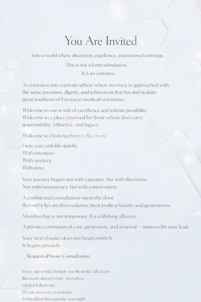 WELCOME TO DESLONGCHAMPS RECOVERY What if? There was a world reserved for those who understand that true wealth is not measured in assets — but in clarity, vitality, and peace? The Deslongchamps Method™ A science-based, proven approach to deep recovery. Clinical precision. Nervous system restoration. Biochemical rebalancing. Family integration. Environment as medicine. Every element works together. Nothing is accidental. 360° Medical & Therapeutic Care Executive Detox. Evidence-Based Psychosocial Support. Integrative therapies. Specialist collaboration. One Client at a Time. Advanced medicine — delivered without institutional presence. Safety without spectacle. Intensive Executive Restoration For founders. Leaders. Public figures. Burnout and addiction addressed together. Confidential immersive intensives. Schedule-sensitive design. High-performance recovery. Because your responsibilities don’t pause. They evolve. Environment Shapes Outcome Ocean. Forest. Mountain. Architectural brilliance. Global private residence partnerships. Architectural psychology. Nature-based restoration. Environmental curation. Space becomes part of the therapeutic design. Discretion & Continuity Your world continues. So does your care. International mobility. On-call therapeutic presence. Immediate crisis response. Long-term monitoring and integration. Across borders. Across seasons. Across residences. Family Restoration Healing extends beyond the individual. Private family intensives. Relational repair. Legacy preservation. Recovery is not personal. It is generational. Reach Out To Us